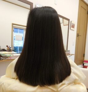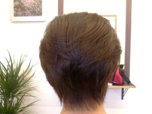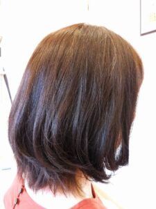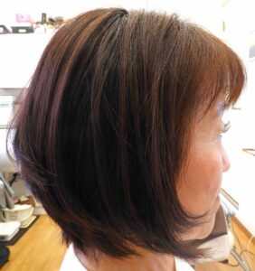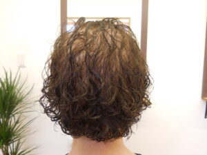 TOPにボリュームが無いためポイントパーマをかけてふっくらさせました | 左サイドからのカットでラインもソフトで流れるようなカットを意識しています |